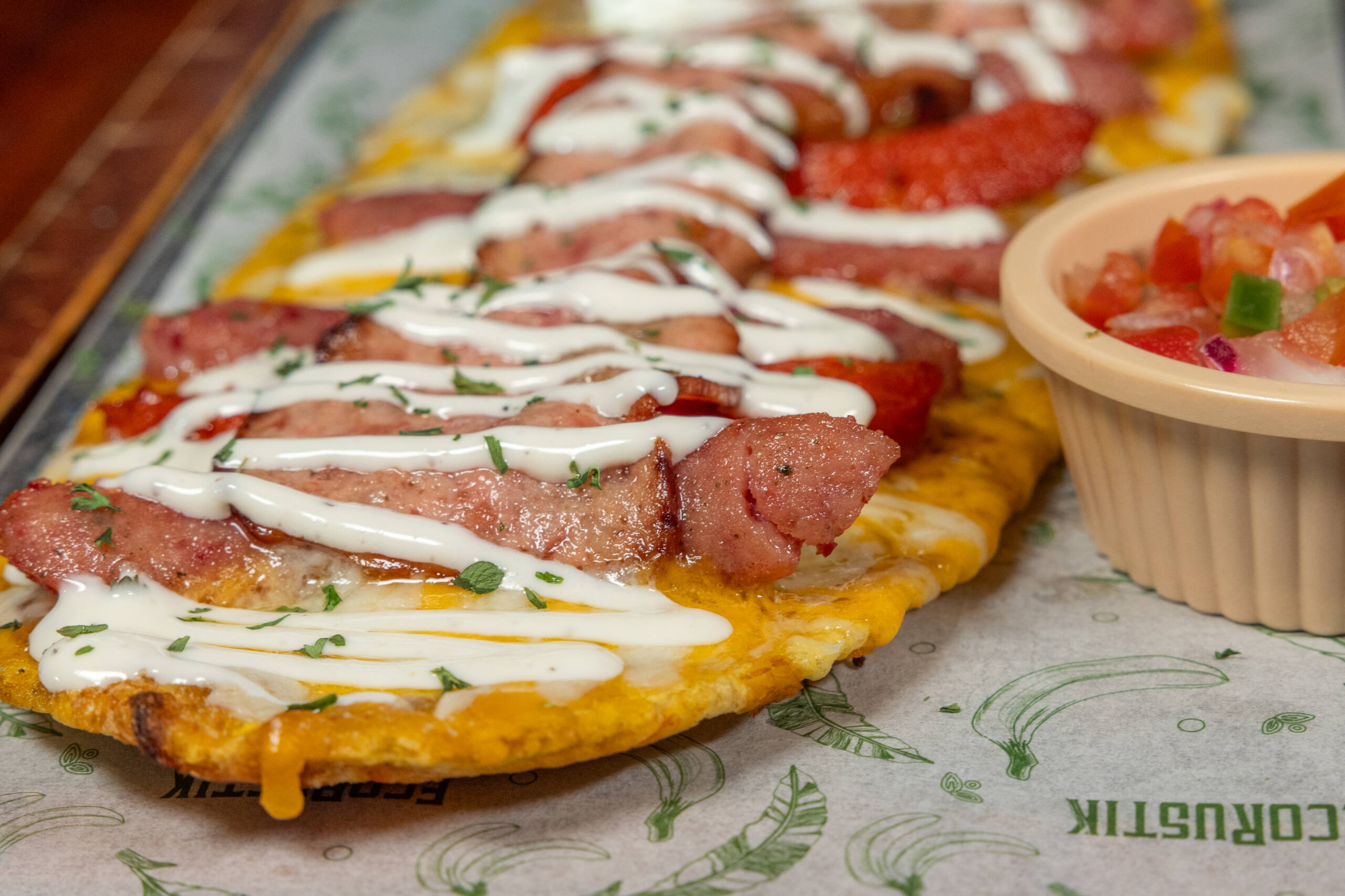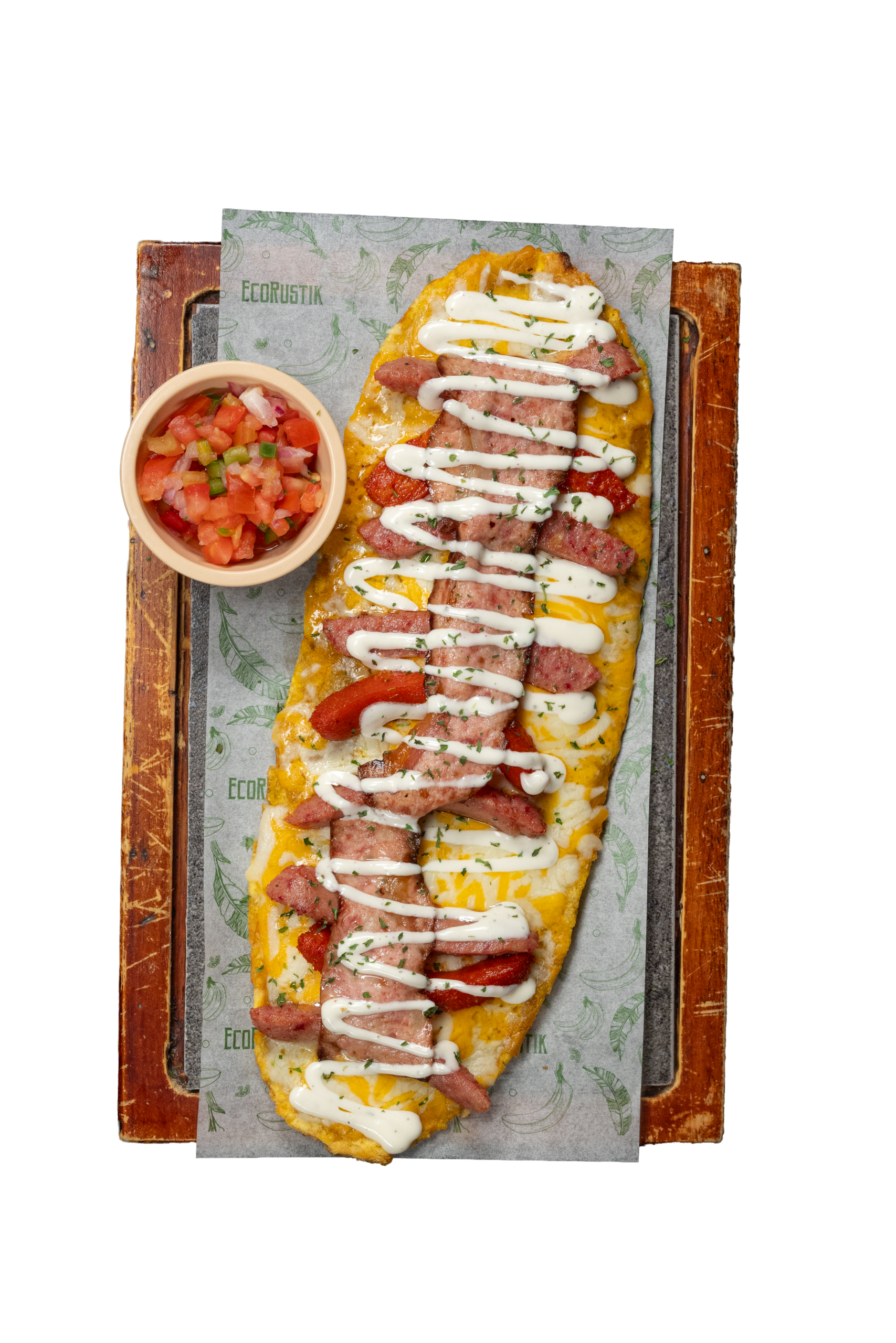 El Tostonazo de Salchicha lleva dos tipos de salchicha a la plancha acompañadas de bacon crujiente, todo sobre plátano frito y cubierto con la infaltable mezcla de 4 quesos fundidos. Sabor intenso en cada capa.