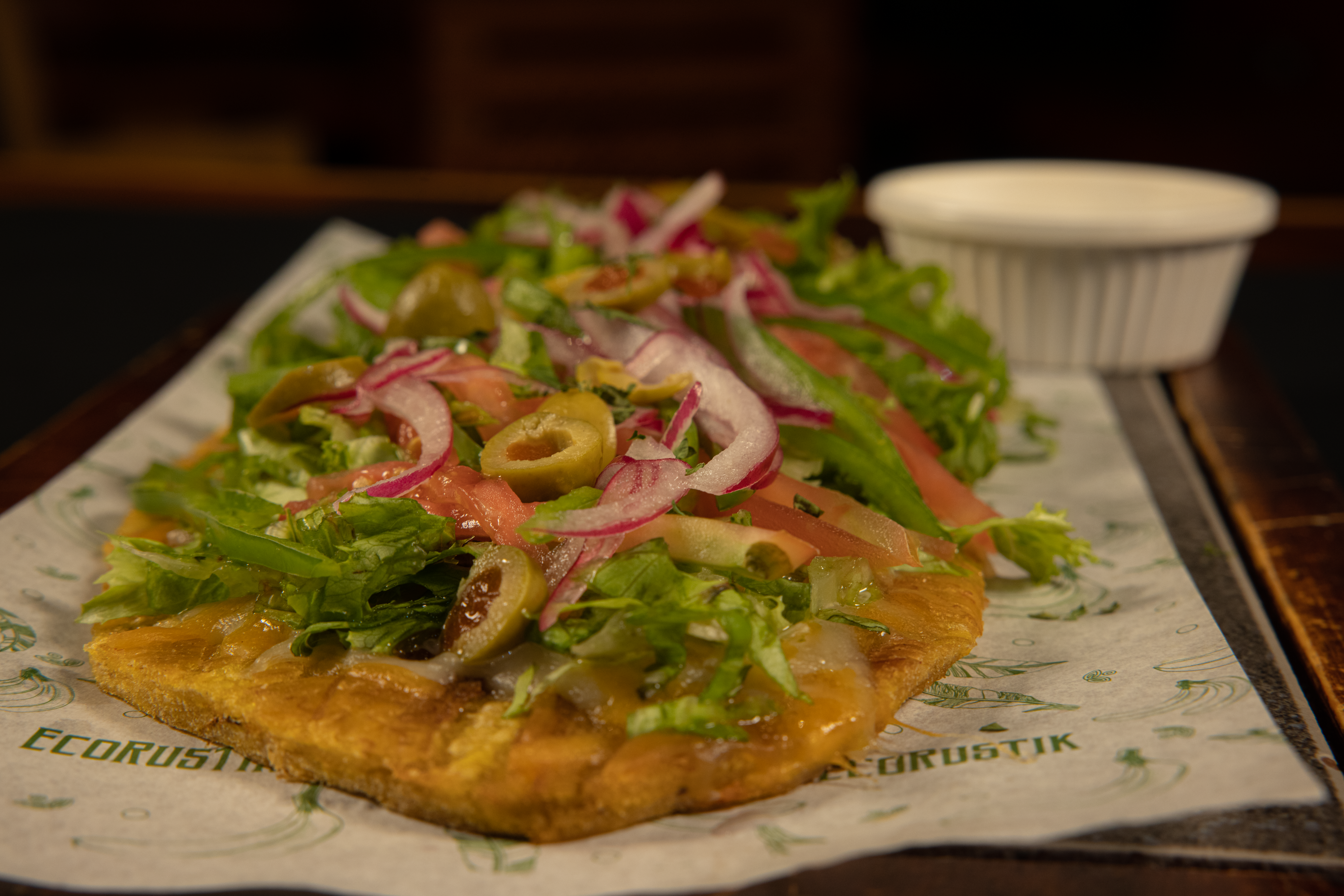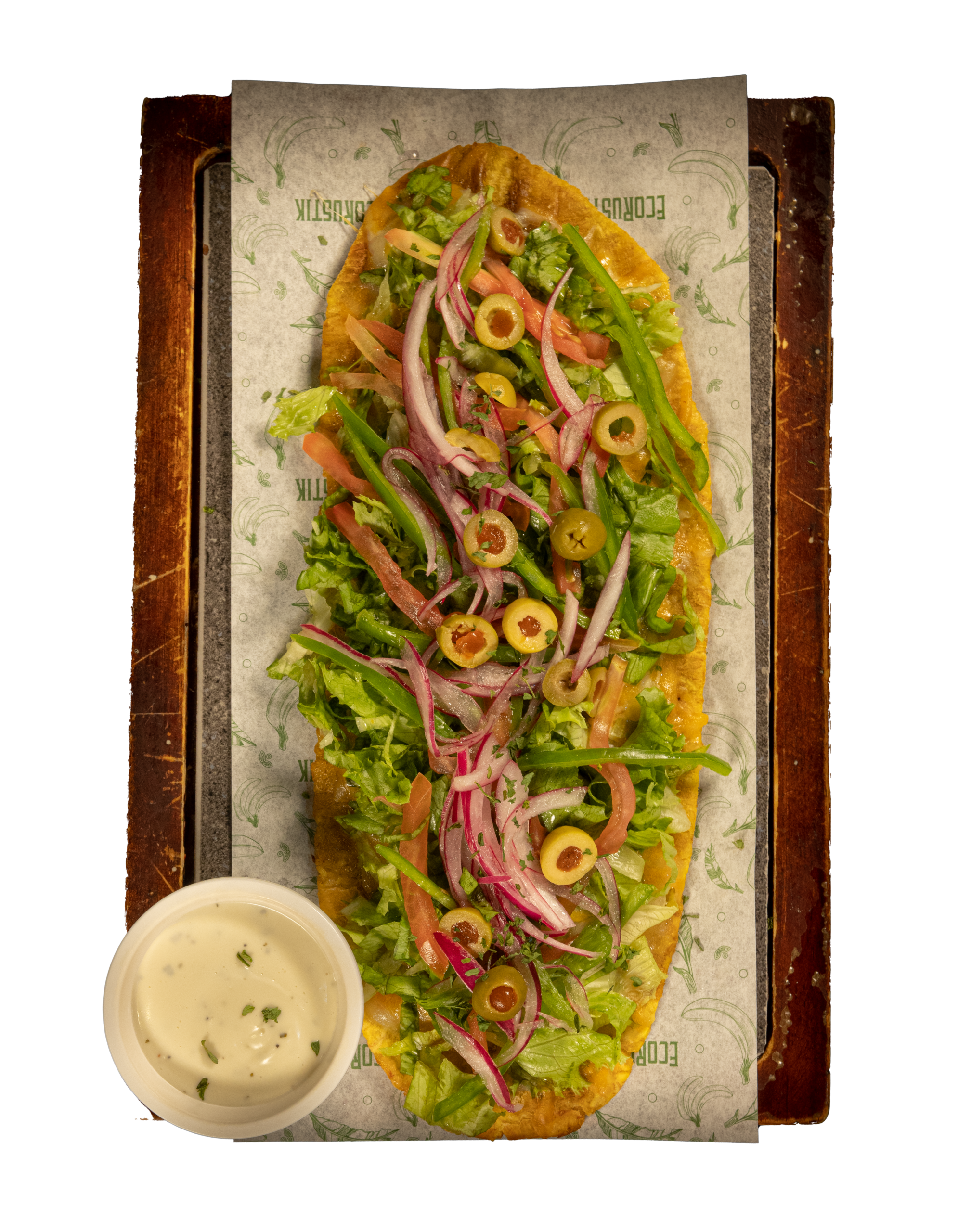 Nuestro Tostonazo Vegetariano es la opción fresca y deliciosa para quienes prefieren los vegetales. Verduras frescas y coloridas sobre plátano frito, acompañadas de aderezo ranch y mezcla de 4 quesos fundidos.