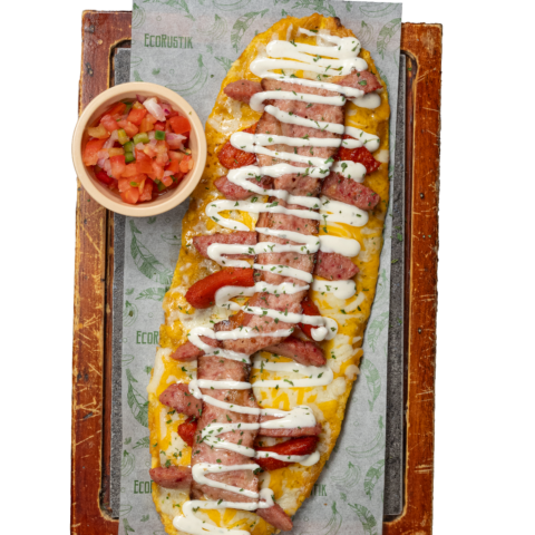 Disfruta del Mega Tostonazo: Plátano doble crujiente acompañado de una deliciosa mezcla de fajitas de res, pollo, cerdo, salchicha, y una irresistible mezcla de cuatro quesos fundidos, coronado con chimichurri y pico de gallo fresco. ¡Un festín de sabores en cada bocado!