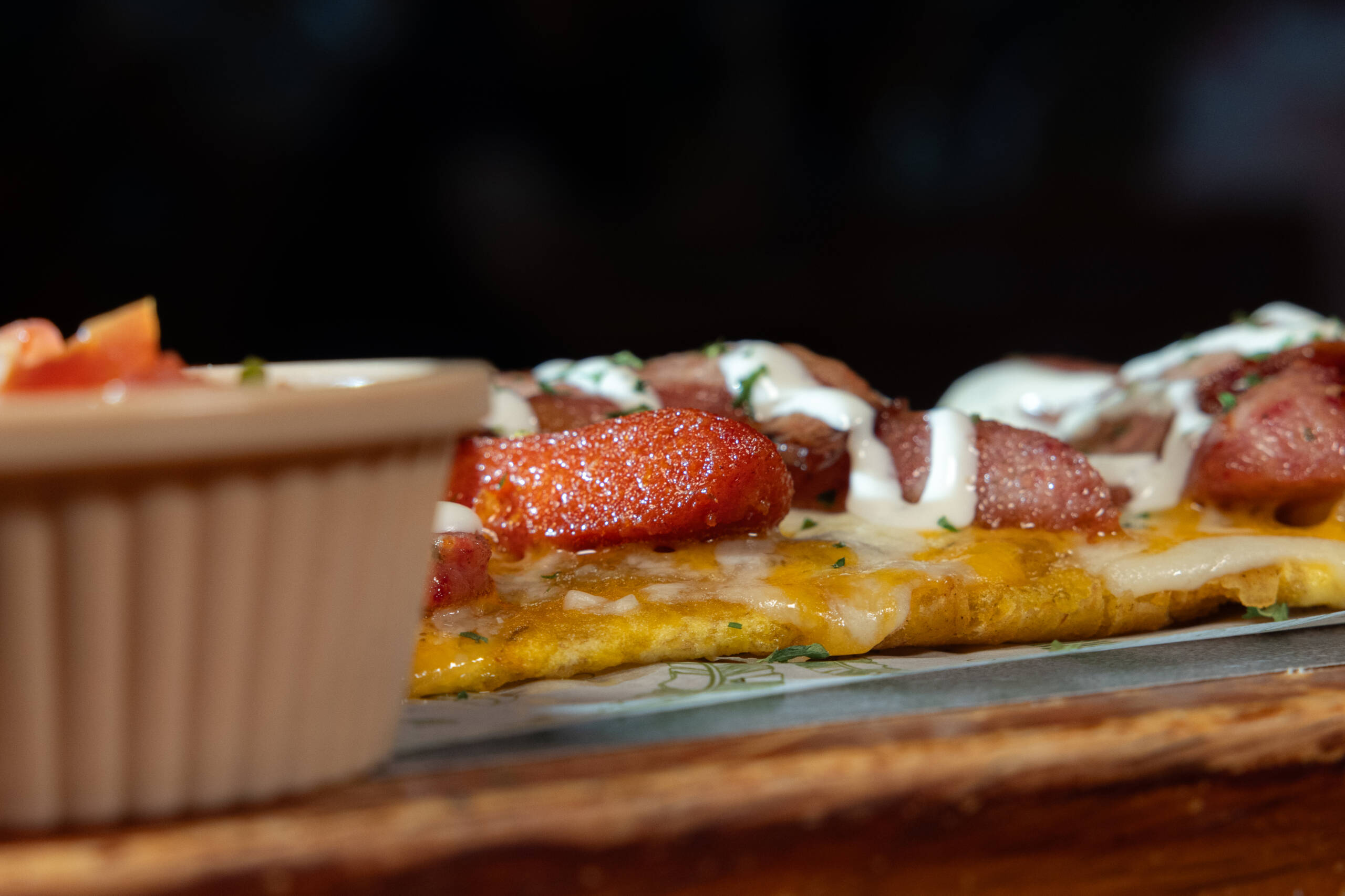 El Tostonazo de Salchicha lleva dos tipos de salchicha a la plancha acompañadas de bacon crujiente, todo sobre plátano frito y cubierto con la infaltable mezcla de 4 quesos fundidos. Sabor intenso en cada capa.